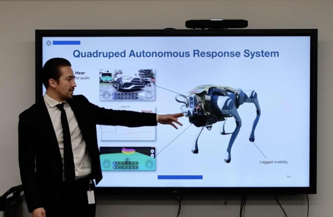 In my role as a Founding Engineer in Silicon Valley, my customer-facing work became investor-facing work. I wrote and edited our pitch decks and presented live demos of our technology to investors and strategic partners, ultimately leading to our $15M seed round and ongoing conversations for raising our Series A. Here I am below, explaining our legged robot capabilities in an investor pitch.